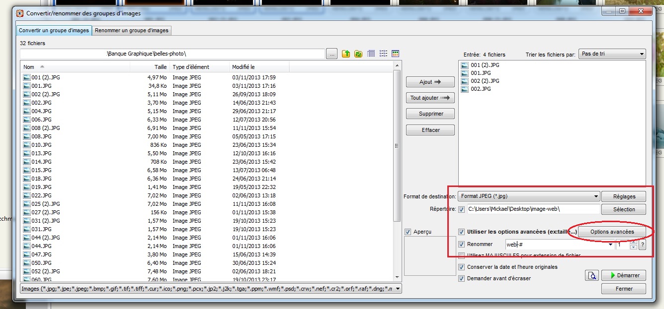 - VIII. Cliquer sur "Démarrer", la liste des fichiers créés apparaissent progressivement, la conversion est réussie si l'info "Nouvelle taille" est nétemment inférieur à l'info "Ancienne taille" ;