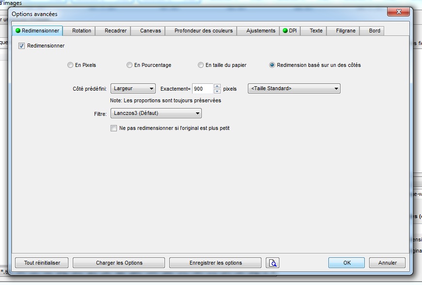 - VI. Configurer les options en s'inspirant de la copie d'écran ci-dessous, le paramètre "Côté prédéfini" permet de définir une largeur fixe pour toutes les images ;